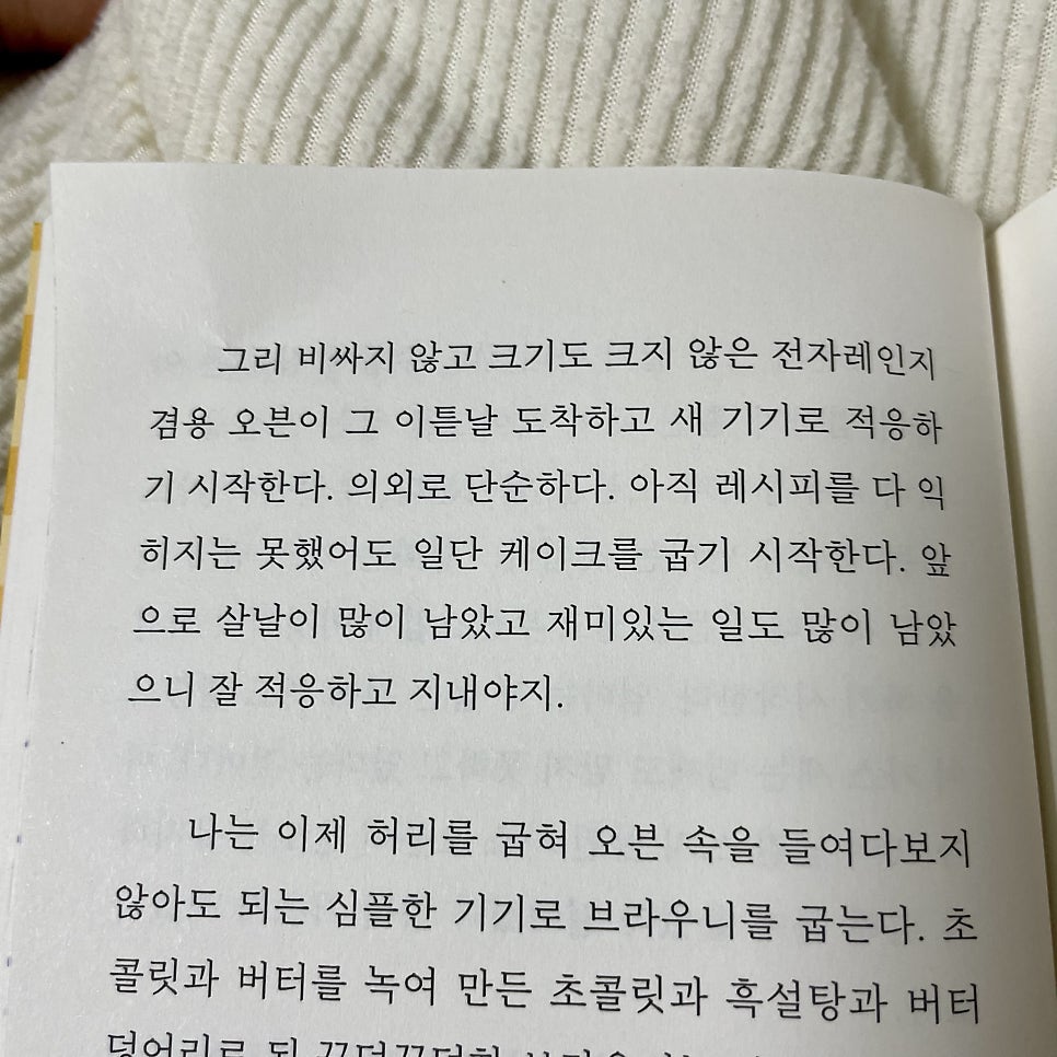 그리 비싸지 않고 크기도 크지 않은 전자레인지 겸용 오븐이 그 이튿날 도착하고 새 기기로 적응하기 시작한다. 의외로 단순하다. 아직 레시피를 다 익히지는 못했어도 일단 케이크를 굽기 시작한다. 앞으로 살날이 많이 남았고 재미있는 일도 많이 남았으니 잘 적응하고 지내야지. - p.68