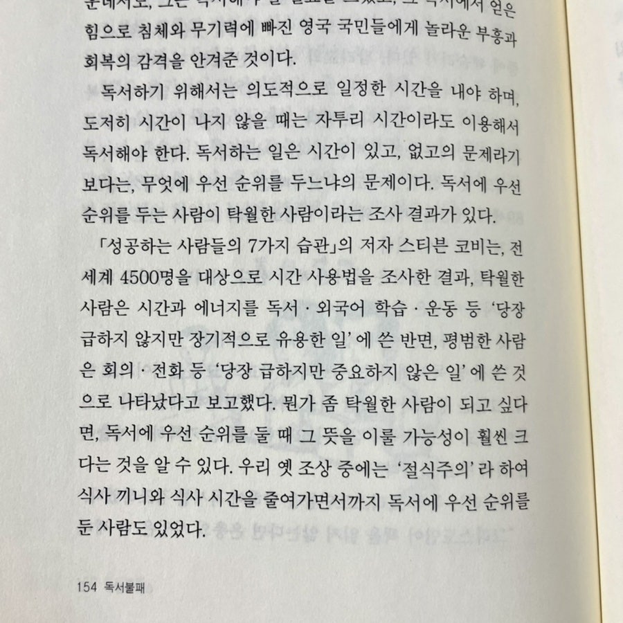 탁월한 사람은 시간과 에너지를 독서· 외국어 학습·운동 등 '당장 급하지 않지만 장기적으로 유용한 일'에 쓴 반면, 평범한 사람은 회의 · 전화 등 '당장 급하지만 중요하지 않은 일' 에 쓴 것으로 나타났다. - p.154